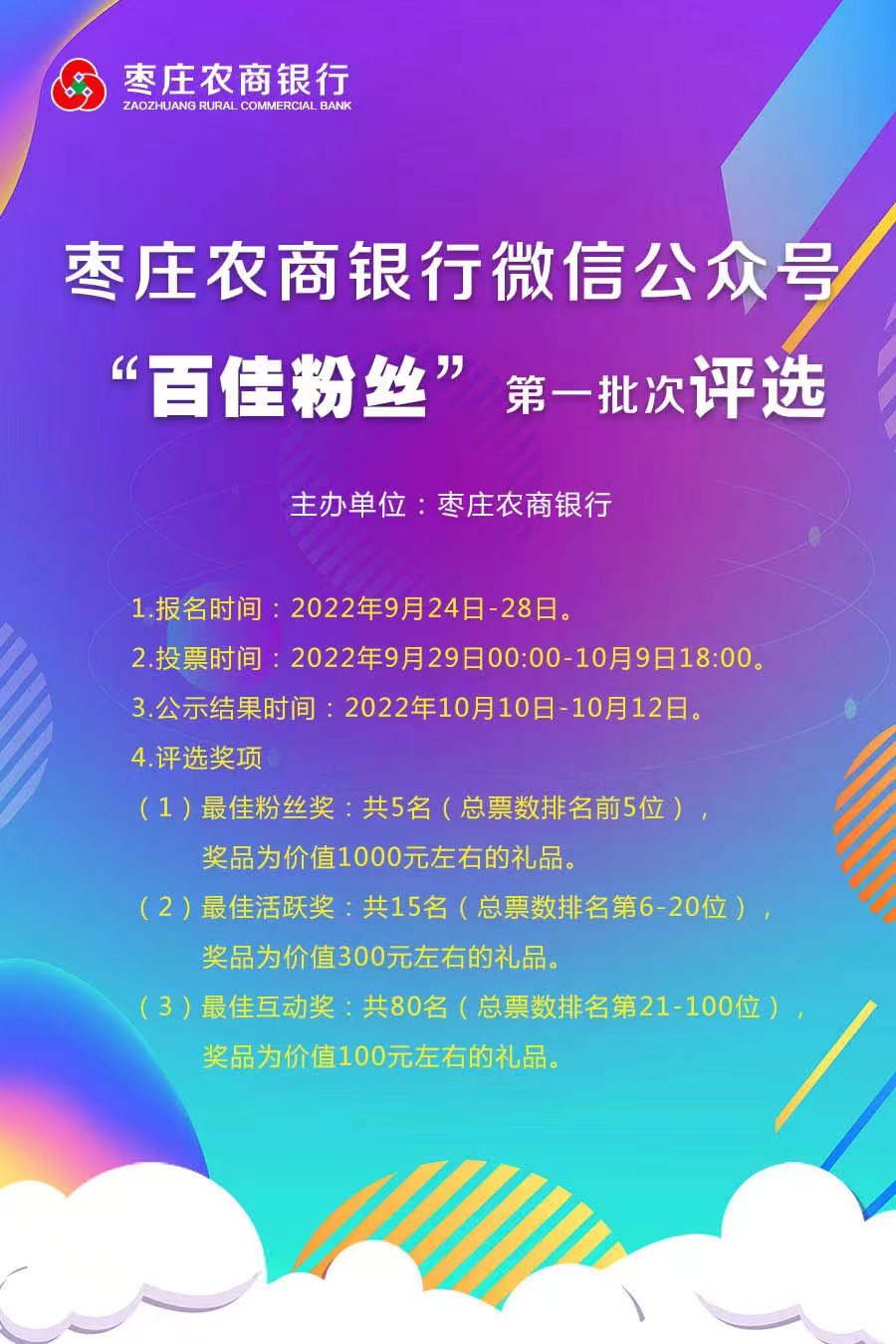 棗莊農商銀行微信公眾號"百佳粉絲"第一批次評選開始,有神秘大禮