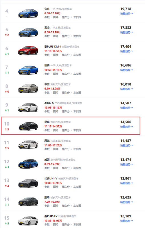 近日,各大汽車廠商今年10月份的銷量成績終于公布了,雖然A級轎車榜單前三名依舊和9月份一樣,都是被日產(chǎn)軒逸、大眾朗逸、豐田卡羅拉所占據(jù),但,10月份的A級轎車榜單卻出現(xiàn)了一款“黑馬”車型,因?yàn)檫@款車在9月銷量榜單里還是第十九名,但是到了10月份,卻以月銷14506輛的成績,銷量“排名”直接上升了9個(gè)名次,躍居至10月份銷量榜單第十名位置,該車就是2023款全新吉利星瑞,這款車有什么特色呢?該車系哪款車型可以參考呢?一起來了解一下吧。