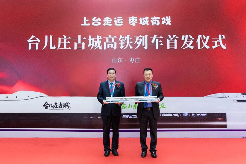 隨后,出席嘉賓共同為“臺(tái)兒莊古城”高鐵冠名專列首發(fā)啟程進(jìn)行剪彩并互贈(zèng)紀(jì)念品。