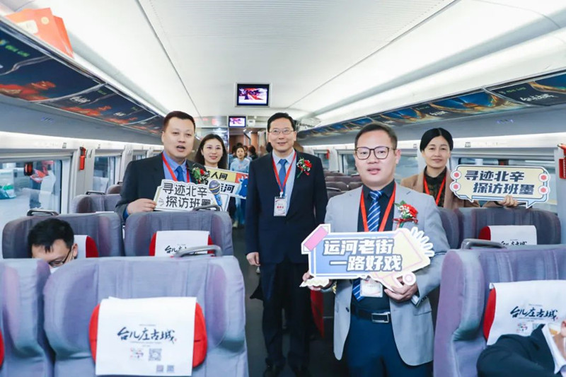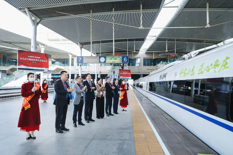 4月27日上午,由臺(tái)兒莊古城冠名的高鐵列車首發(fā)儀式在濟(jì)南西站隆重舉行。首發(fā)儀式上,車身標(biāo)有“好客山東 匠心棗莊”的高鐵列車正式亮相。